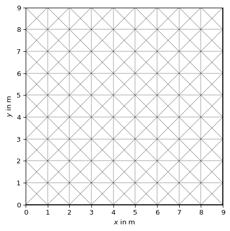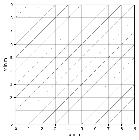 >>> import pygimli as pg >>> import pygimli.meshtools as mt >>> quads = pg.createGrid(range(10), range(10)) >>> ax, _ = pg.show(quads) >>> ax, _ = pg.show(mt.refineQuad2Tri(quads, style=1)) >>> ax, _ = pg.show(mt.refineQuad2Tri(quads, style=2)) >>> pg.wait()