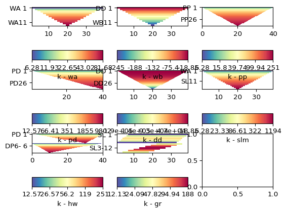 >>> import matplotlib.pyplot as plt >>> from pygimli.physics import ert >>> >>> schemes = ['wa', 'wb', 'pp', 'pd', 'dd', 'slm', 'hw', 'gr'] >>> fig, ax = plt.subplots(3,3) >>> >>> for i, schemeName in enumerate(schemes): ... s = ert.createData(elecs=41, schemeName=schemeName) ... k = ert.createGeometricFactors(s) ... _ = ert.show(s, vals=k, ax=ax.flat[i], label='k - ' + schemeName) >>> >>> plt.show()